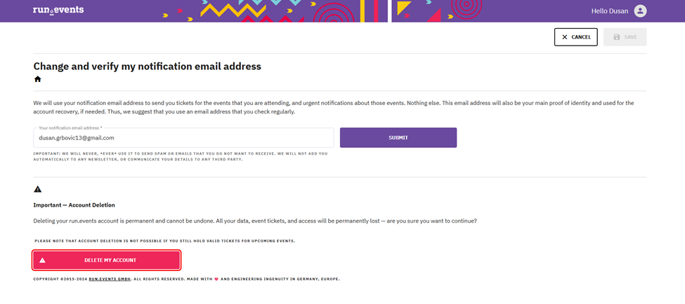 In some cases, you will need to change either the notification address, the login provider, or both, for your run.events account. This happens mostly when users are changing their companies, and they need to update their contact info.