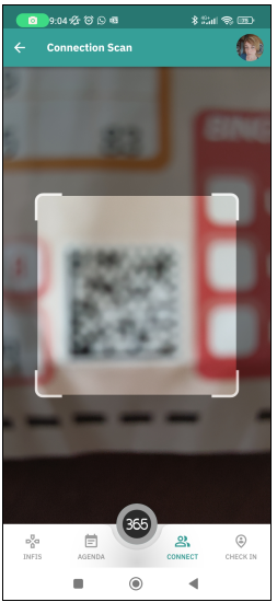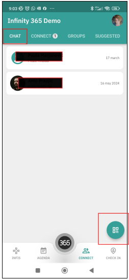You can instantly connect with another attendee by scanning their badge. To scan a badge, open the Chat tab, tab the Scanning button (QR Code icon) and point your device at the attendee’s badge.