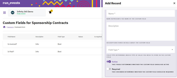 Custom fields in Sponsorship Contracts allow you to capture additional, detailed information for each contract. These fields help ensure that all agreements with sponsors are complete, well‑documented, and tailored to your event’s needs.