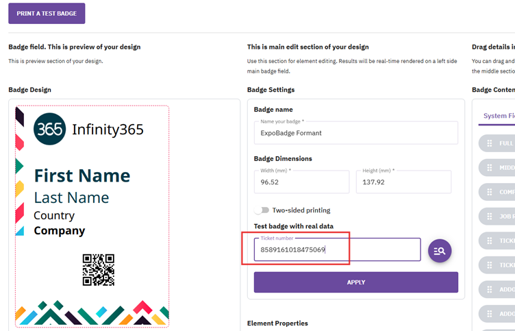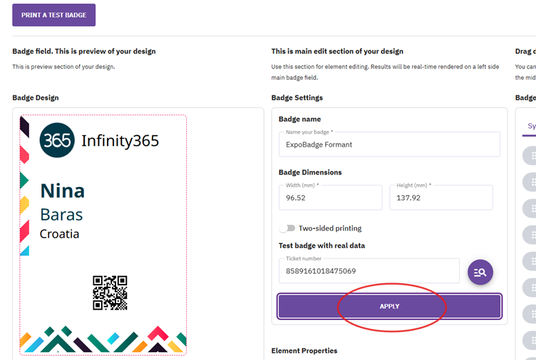 - Click 'Apply' to populate the badge with real attendee data