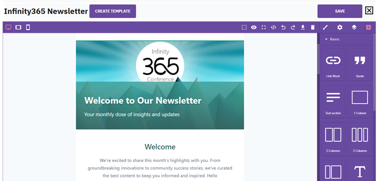 After creating and opening a new design, you'll see the email builder interface where you can use drag-and-drop functionality to add components such as: