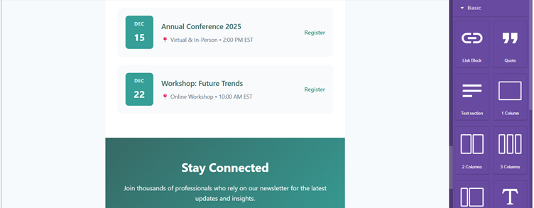 - Plus Icon – Displays all available drag-and-drop modules you can use to build your email template.