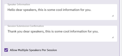- Speaker Information Text – displayed on the Speaker Dashboard before submission