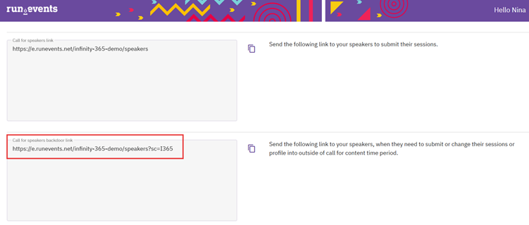 Speakers with the secret code can use the Call for Content Backdoor Link to submit content even after the Call has closed.