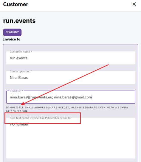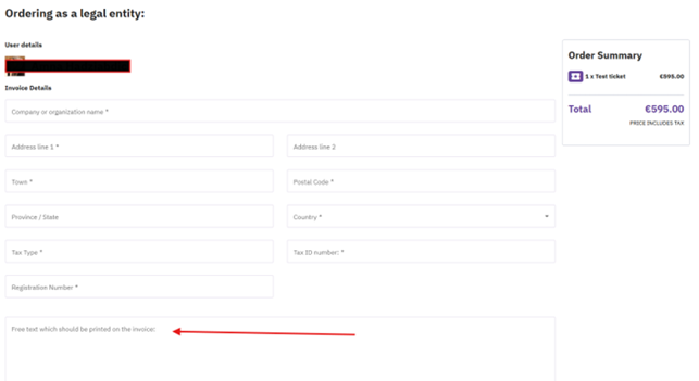 Free Text field for Customers - This free text field will be optional as part of the Attendee Online Registration and Ticketing process, in the Payment step when a Customer is buying a ticket and it will be visible in the Invoice.