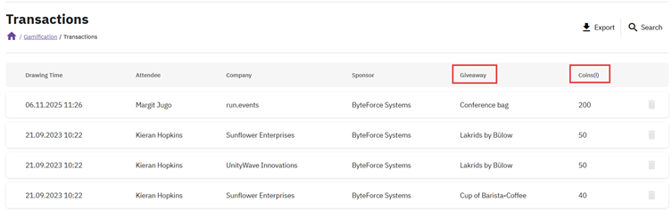 These areas provide a clear overview of how attendees are spending coins, giving organizers and sponsors insight into engagement patterns and the effectiveness of gamification features.