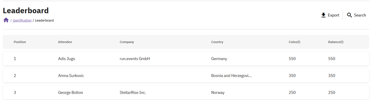 The Leaderboard allows you to see who is leading, how many coins attendees havecollected, and their current coin balance or status.