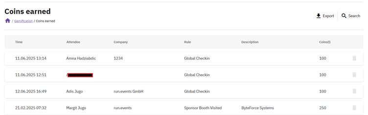 This ensures that organizers and sponsors have a complete overview of attendee engagement, including how coins are earned (e.g., booth visits, session attendance, survey completion).