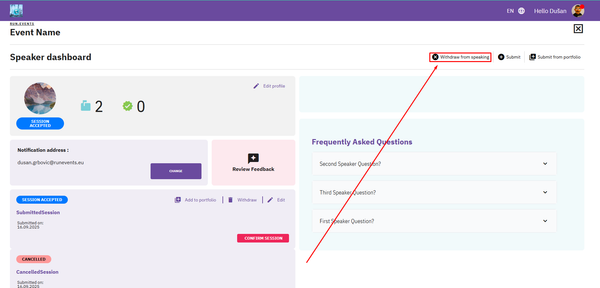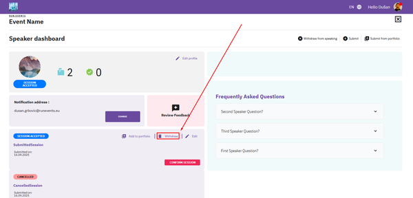 If you wish to withdraw your session from event please do so by clicking on "Withdraw" button next to the session in question.