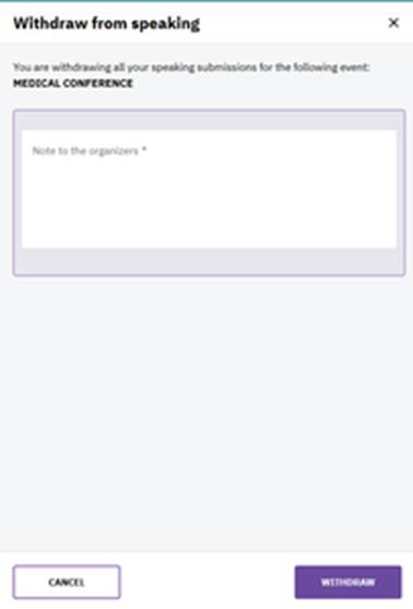 On the other hand, clicking the button "Withdraw from Speaking" would remove you from the event as a Speaker.