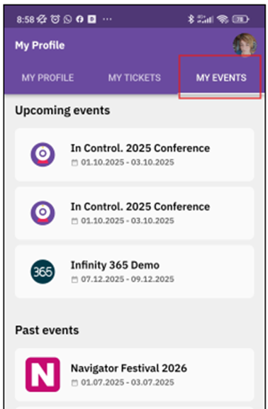 Click on the My Events tab to view a list of all your upcoming and past events for which you hold a ticket. This helps you stay organized and easily access event details.