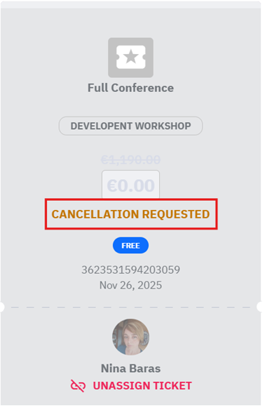 When the event organizer approves the cancellation and/or refund, the ticket status will update to Cancelled or Refunded: