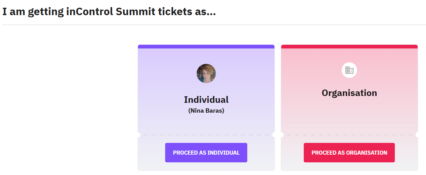 Tickets can be ordered either as an Individual or on behalf of an Organization, depending on the attendee’s preference.