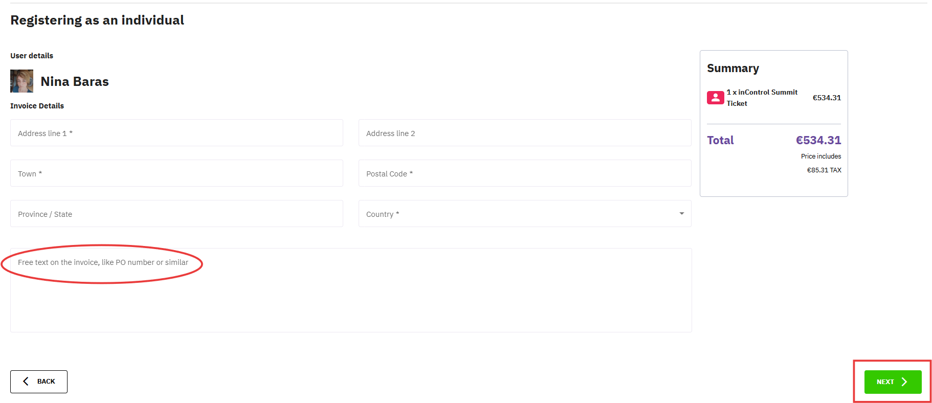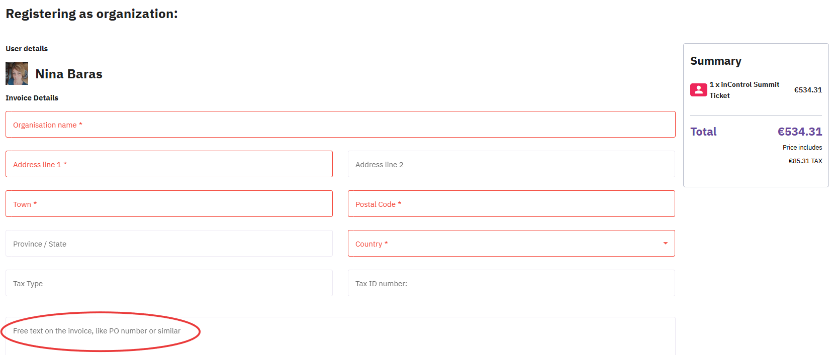 If you need to include additional text such as a PO# (purchase order number), enter this information in the Free Text field during the attendee online registration and ticketing process. This field is available in the Payment step when purchasing a ticket, and any text added here will appear on the final invoice.