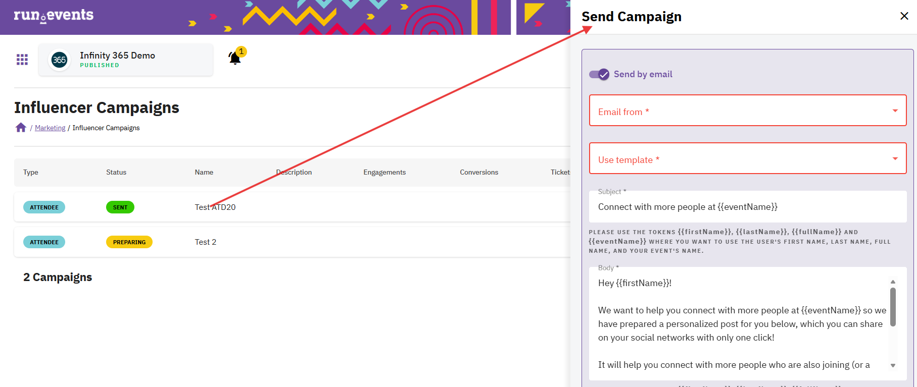 When „Email” and “Push notification” details are defined you can press “Send” to reach your audience. Congratulations – your first “Influencer Campaign” thanks to run.events has been sent! 😉