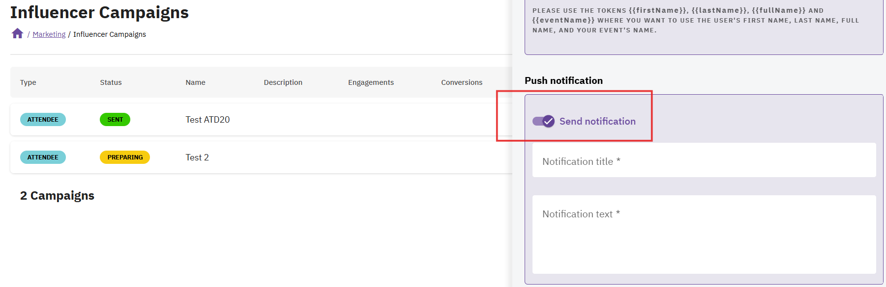 You can (optional) also send „Push notification” via mobile app to your attendees. For instance, you can share an info with them about influencer campaign details and voucher code sent via e-mail, etc.