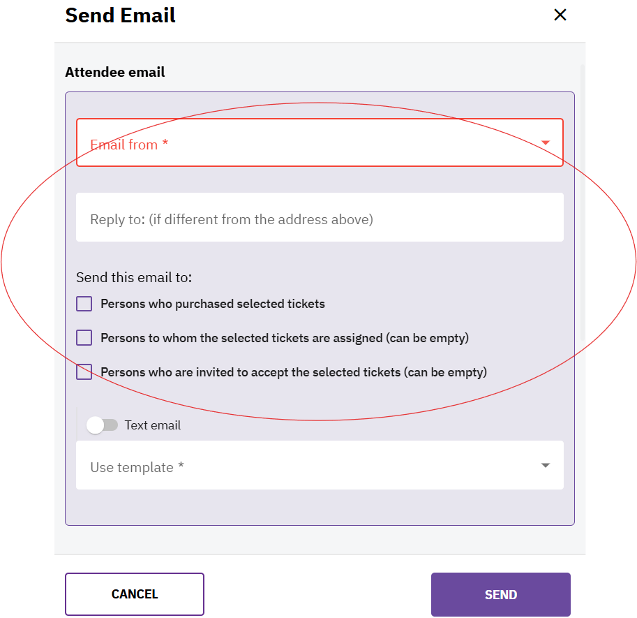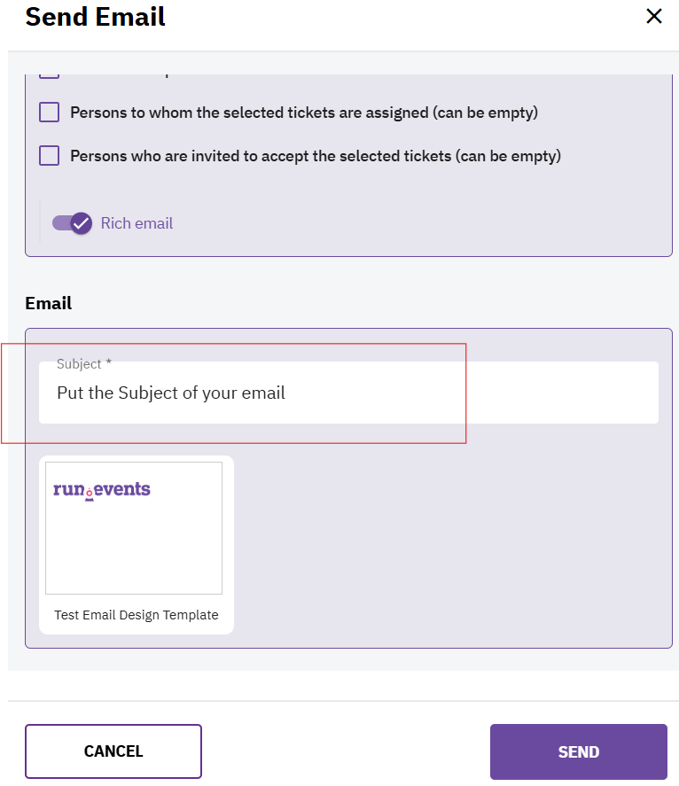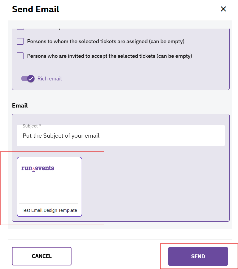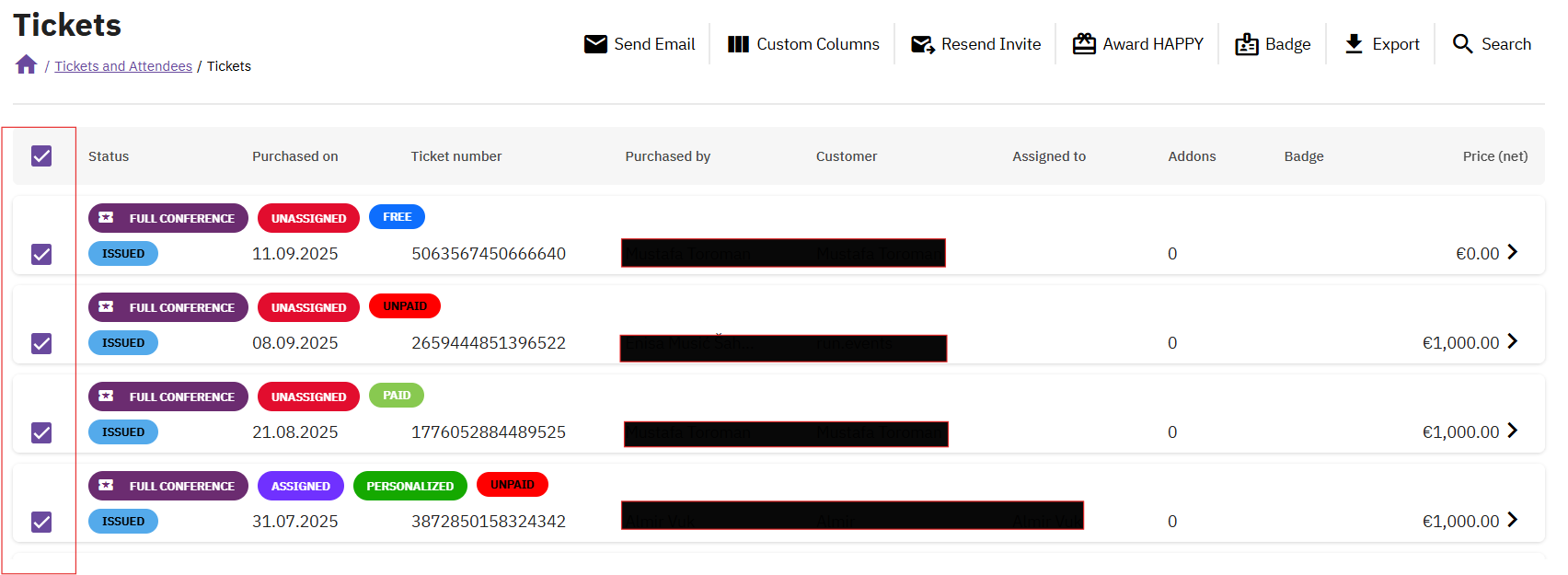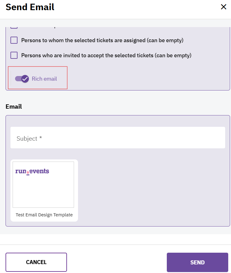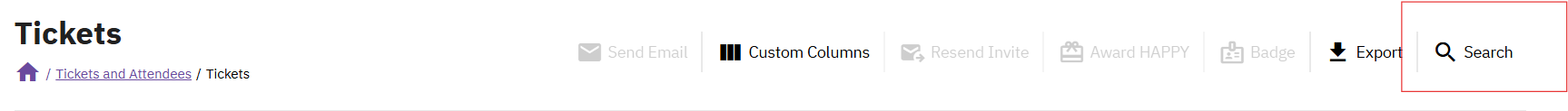 Using the Search and Filter options, select the Tickets and Attendees who should receive your Rich email: