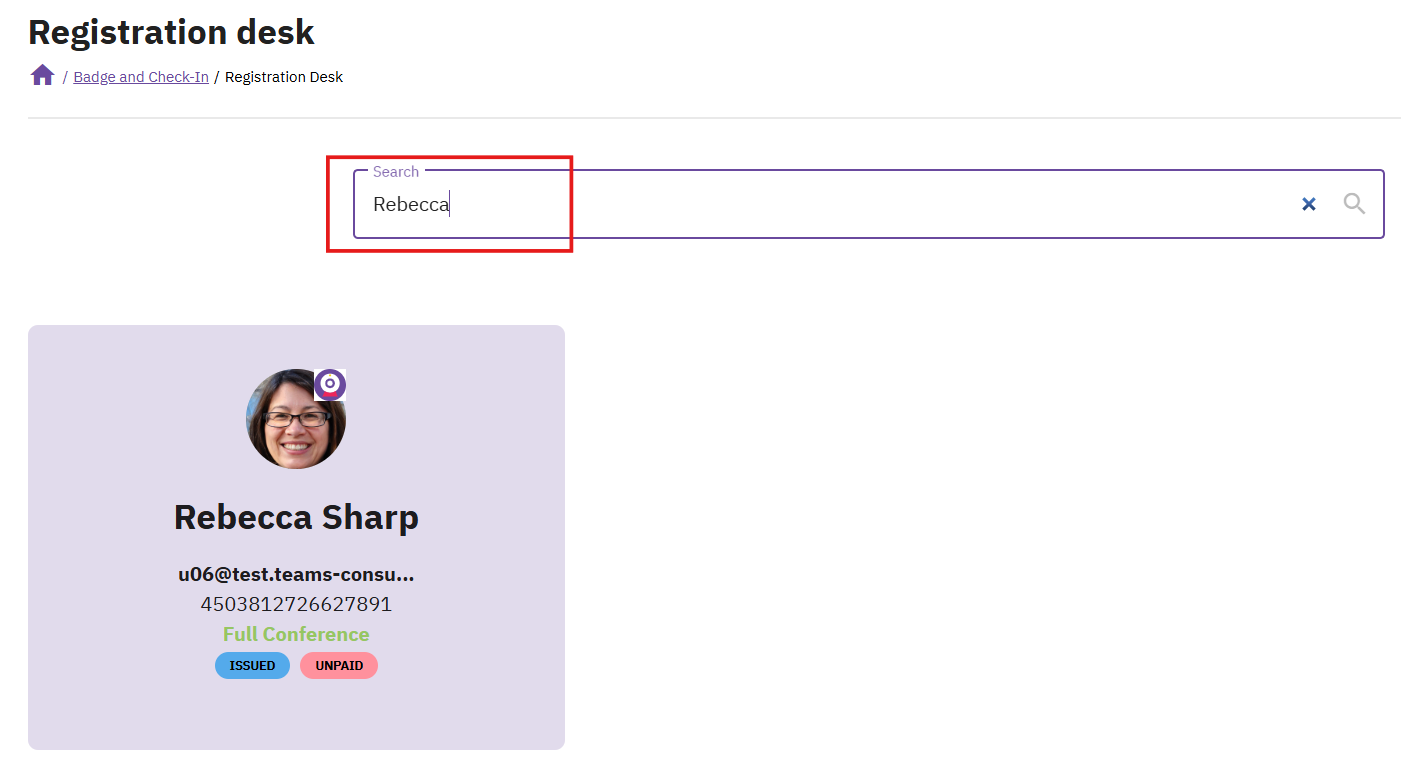 Sometimes, the person approaching the registration support desk might not bring the ticket. In such case, you can easily find the ticket by typing in the attendee‘s name, or eventually the name of the ticket purchaser, by using the Search field on the Registration Desk screen: