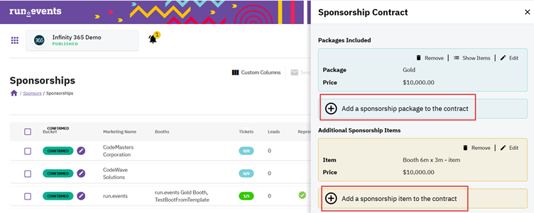 - Sponsorship Packages and Items - You can add or adjust packages and individual items included in the contract.