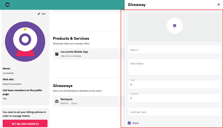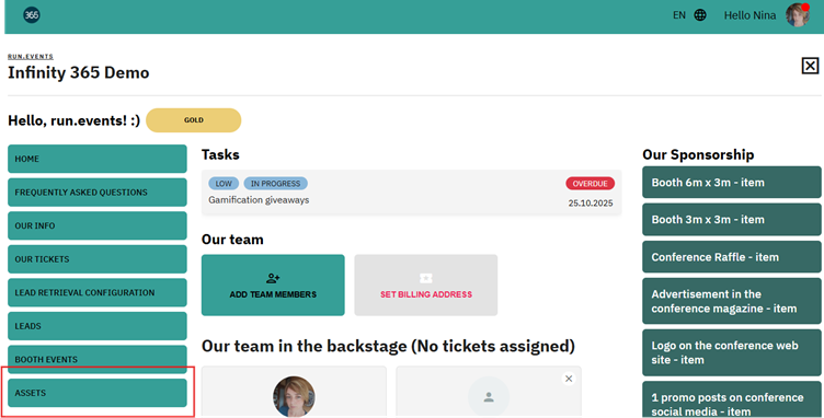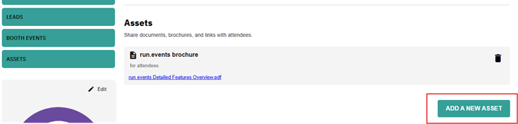 The Assets tab allows Sponsor Representatives to upload and manage all materials that will appear on their sponsor profile in the event website (if enabled) and in the run.events mobile app. These assets help attendees learn about your company, connect with your team, and explore your products or giveaways.