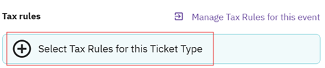 - Go to: Tickets & Attendees -> Ticket Configuration -> Ticket Type edit button -> Ticket Type “pricing” Tab -> Manage Tax Rules for this event