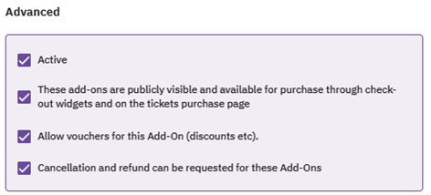 Configure via the following checkboxes, whether the Add-on should be active, publicly visible, allow vouchers and/or eligible for cancellation and refund: