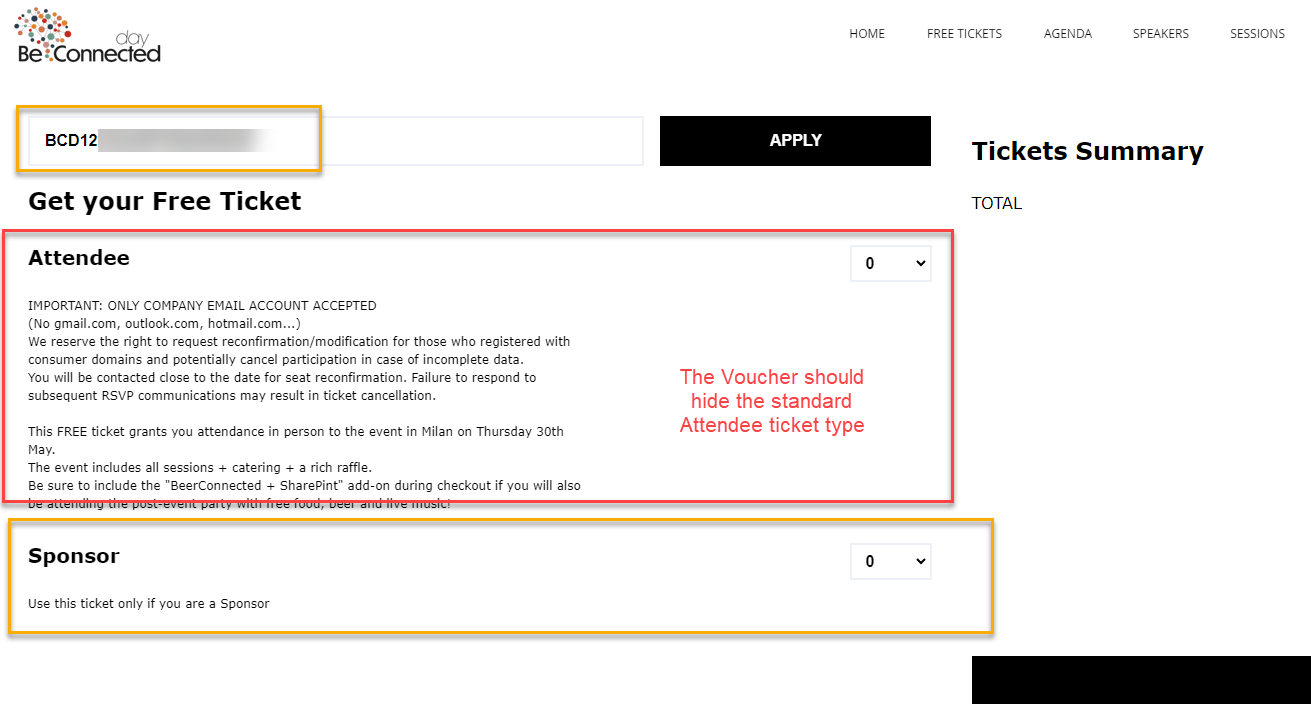 We've many Sponsors and Speakers that used the Voucher to show their dedicated Ticket type, but ordered the Attendee ticket anyway! (no comment) :-(